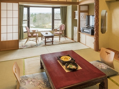 やわらかな外光が注ぐシャングリラ館の和室。梁の飾り彫りが格調高い雰囲気を演出しています。 |