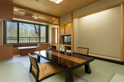 ガラス越しの木々の緑が目にも鮮やか。和のやさしい風合いが漂う、くつろぎ感あふれる客室です。