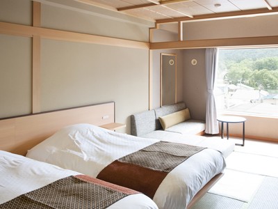 「ウイングス館」にある和ツインタイプの客室です。 和室のお部屋にベッドをご用意いたしました。ごゆっくりお寛ぎください。 <客室の主な設備> ・広さ:36平米 ・眺望:街側 ・寝具:ベッド2台(3名様でご宿泊の場合は1名様は布団利用となります) ・ユニットバス ・禁煙 ※全客室禁煙です。喫煙される場合は喫煙所をご利用ください。 ※鶴雅グループが取り組むSDGsの推進のため、歯ブラシなどのアメニティはロビーにご用意しております。